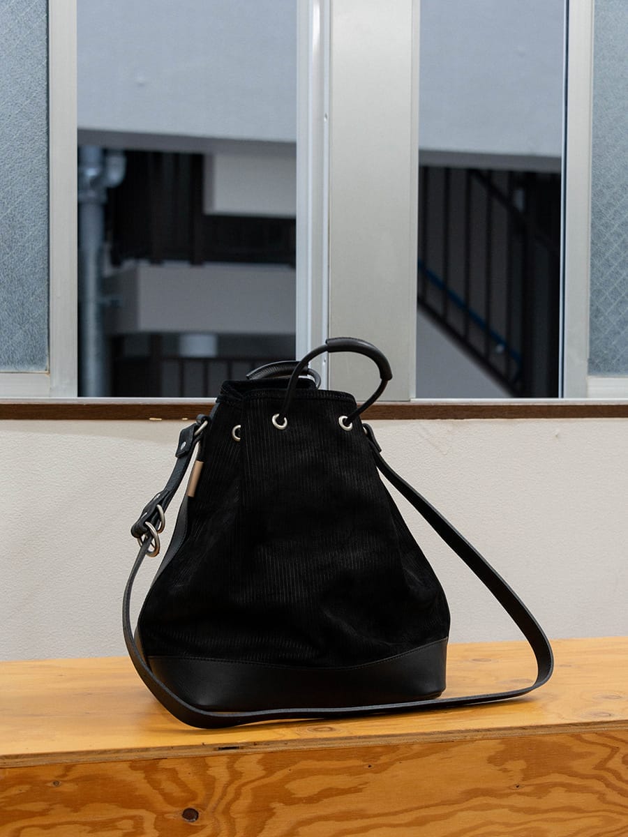 一見可愛らしい巾着的なデザインとシックなコーデュロイレザーのバランス、程よい存在感の大きさがいいなと。手持ちでもショルダーでもしっくりきた。